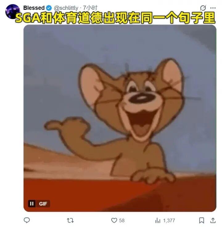 网友@黄曼巴表示 :SGA:每场比赛我的圆柱体被侵犯了那么多次,我都是一碰就倒,我都没有还手,难道还不够友好吗?你们还想怎样?